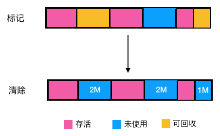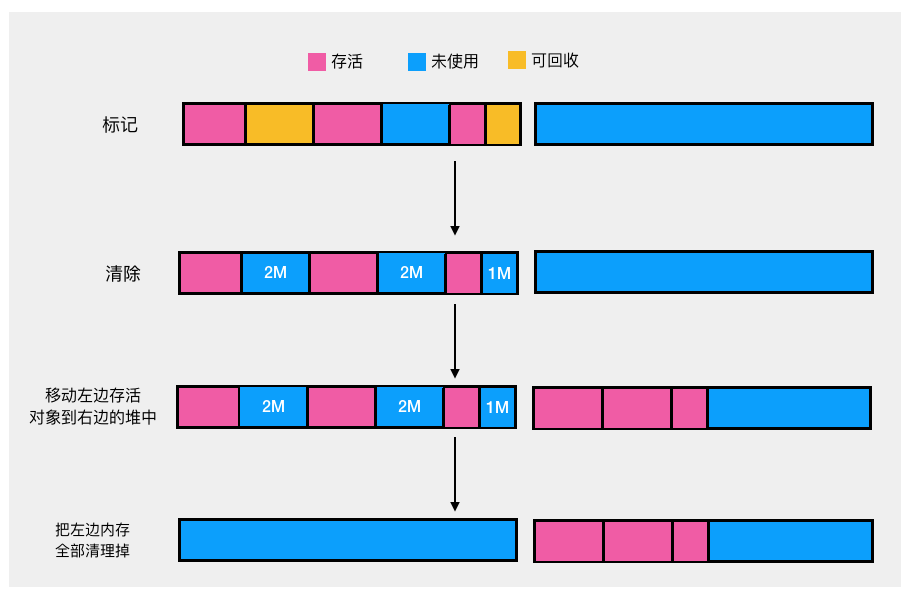 前面两步和标记清除法一样,不同的是它在标记清除法的基础上添加了一个整理的过程 ,即将所有的存活对象都往一端移动,紧邻排列(如图示),再清理掉另一端的所有区域,这样的话就解决了内存碎片的问题。