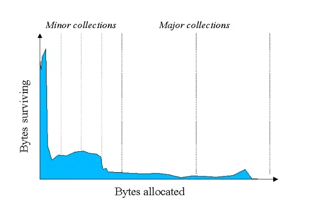 分代收集算法整合了以上算法,综合了这些算法的优点,最大程度避免了它们的缺点,所以是现代虚拟机采用的首选算法,与其说它是算法,倒不是说它是一种策略,因为它是把上述几种算法整合在了一起,为啥需要分代收集呢,来看一下对象的分配有啥规律