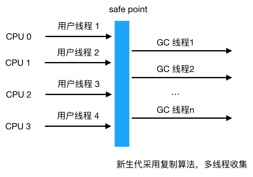 Serial 收集器是工作在新生代的,单线程的垃圾收集器,单线程意味着它只会使用一个 CPU 或一个收集线程来完成垃圾回收,不仅如此,还记得我们上文提到的 STW 了吗,它在进行垃圾收集时,其他用户线程会暂停,直到垃圾收集结束,也就是说在 GC 期间,此时的应用不可用。