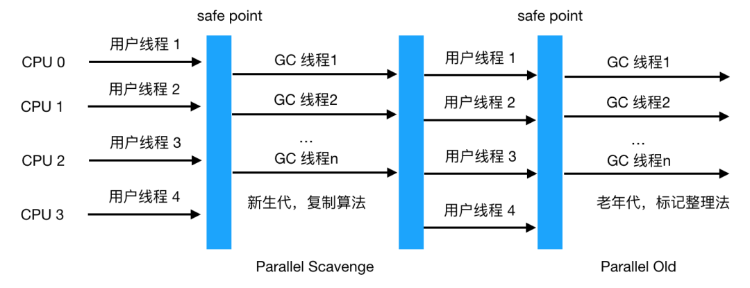Parallel Old 是相对于 Parallel Scavenge 收集器的老年代版本,使用多线程和标记整理法,两者组合示意图如下,这两者的组合由于都是多线程收集器,真正实现了「吞吐量优先」的目标