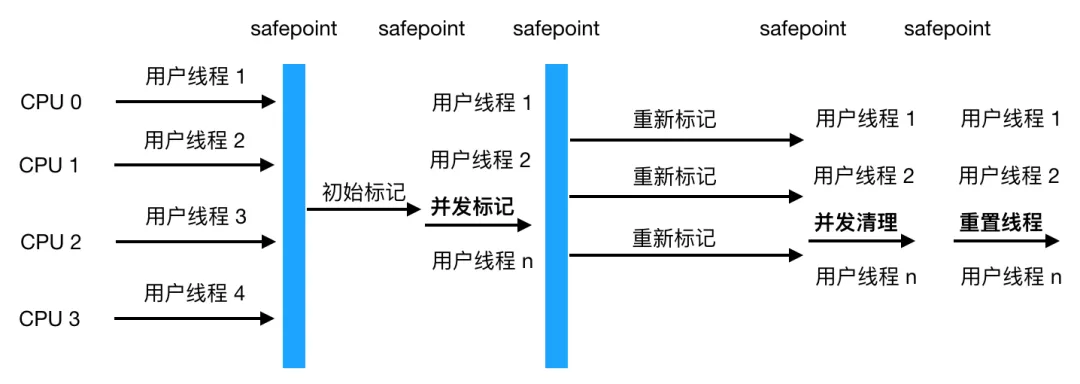 我们之前说老年代主要用标记整理法,而 CMS 虽然工作于老年代,但采用的是标记清除法,主要有以下四个步骤