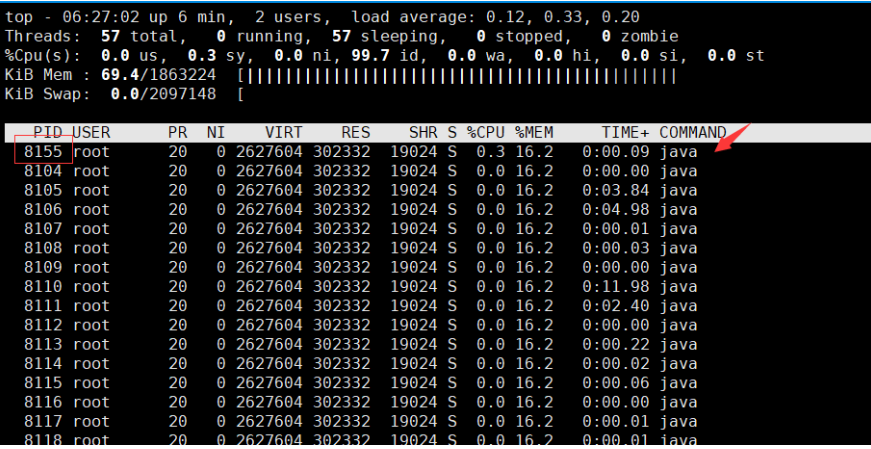 二、然后我们需要知道这个进程有哪些线程,又是哪个线程在占用大量CPU(科普一下:线程是进程的单位,一个进程是由若干线程组成的)。执行命令top -Hp 8104