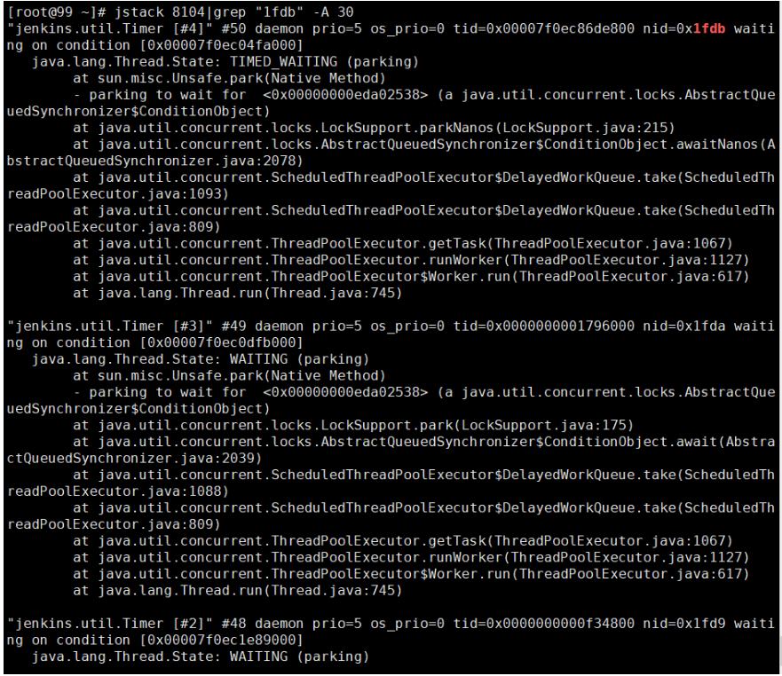 四、接着我们再使用jstack 8104|grep "1fdb" -A 30查看具体的进程信息。解释一下jstack是Prints Java thread stack traces for a Java process, core file, or remote debug server。至于grep -A 30则是显示(上下文,也就是上下行)下文30条相关的语句
