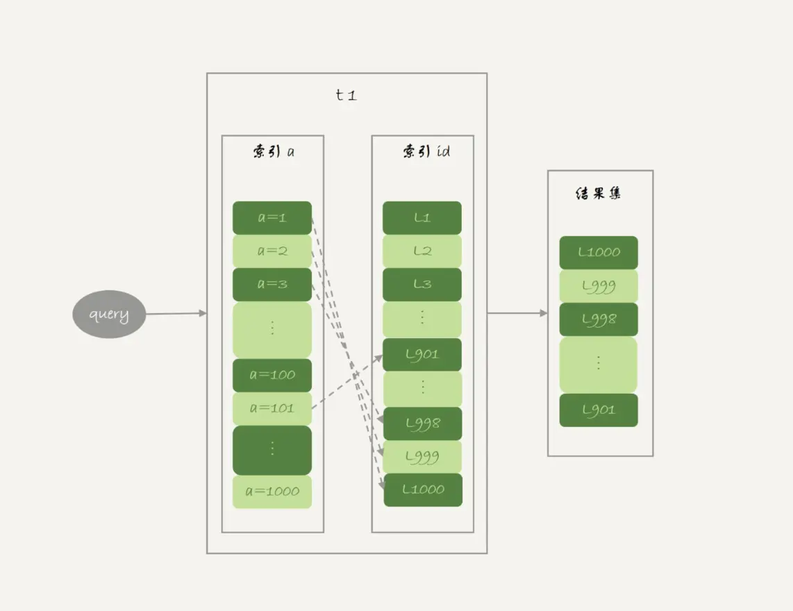 - 根据索引a查到id,放到read_rnd_buffer;