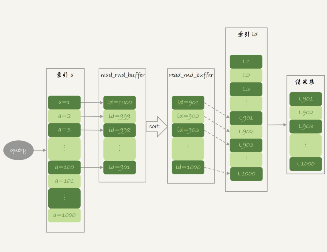 这个过程是一行行查主键索引的,随着a值的增量,id变成逆序,也就是随机访问,性能相对较差,虽然按行查这个机制不能改,但是调整查询的顺序,还是能够有加速的。