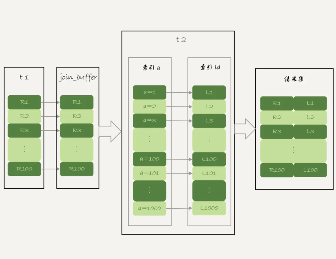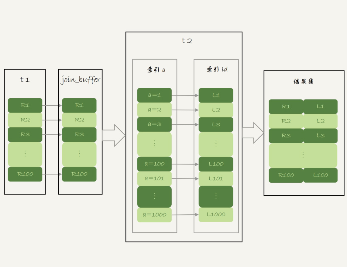 在join_buffer中只放入需要查询的字段,批量与t2匹配,得到一批id,然后t2表就可以用到MRR