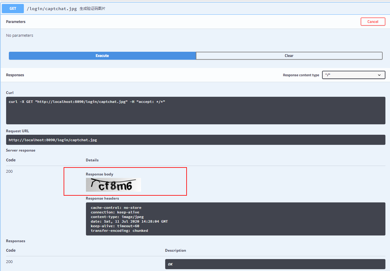打开swagger接口测试页面,执行接口,结果如下。每执行一次,就会重新刷新验证码