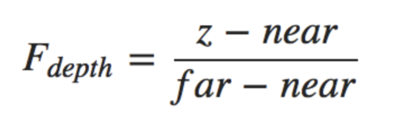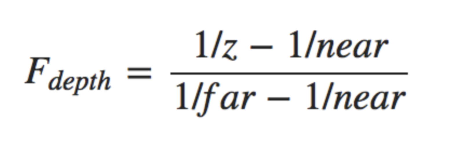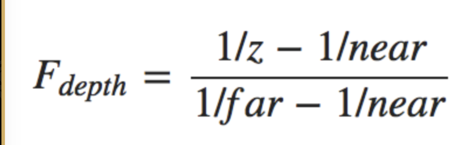 - 在实践中可以减少使用这样的线性深度缓冲区。正确的投影特性的非线性深度方程是和1/z成正比,由于非线性方程和1/z成正比,例如1.0和2.0之间的z值,将变为1.0到0.5之间,将z非常小的时候给了我们很高的精度。方程式如下图