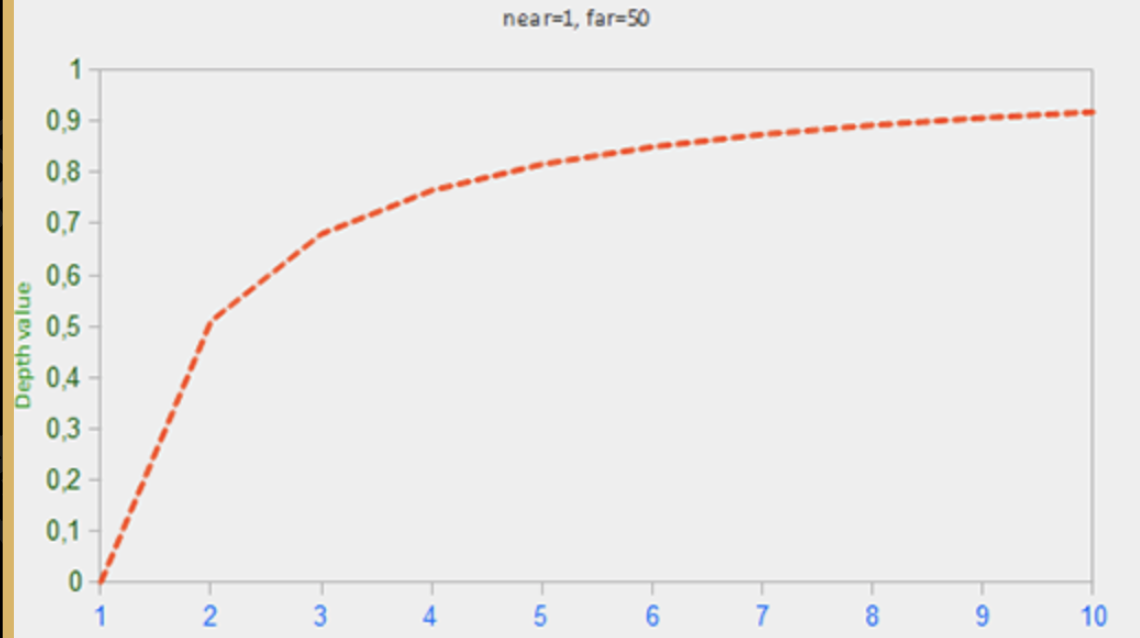 在深度缓冲区的值不是线性的屏幕空间(它们在视图空间投影应用之间是线性)。值为0.5的深度缓冲区并不意味着该对象的z值投影上边的平头解体的中间;顶点的z值是实际上徐娘当接近平面!可以看到z值和产生深度缓冲区的值在下列图标中的线性关系
