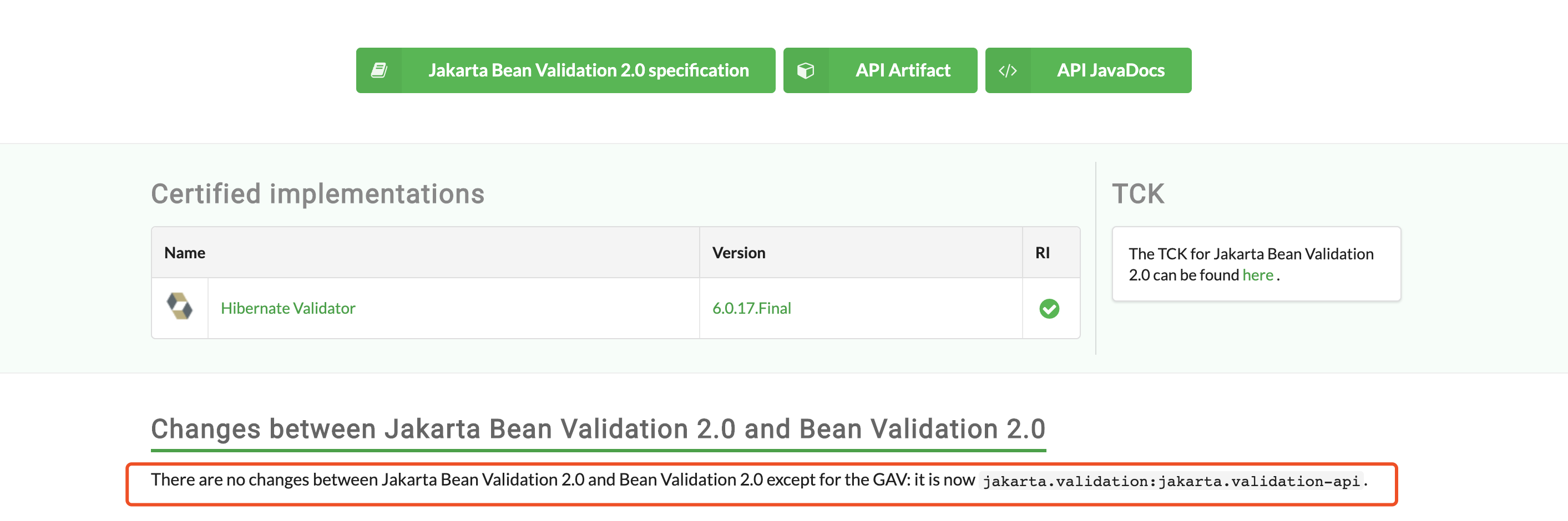 看到下面标红的地方没?除了GAV版本外没有区别,GAV版本的验证API导进去不再是我们熟悉的javax.validation包了。还有,官网通过认证的规范实现来自Hibernate Validator,很多同学可能之前见过这个包,也产生过好奇,Hibernate不是ORM框架吗,怎么还搞验证?别问,问就是两开花。