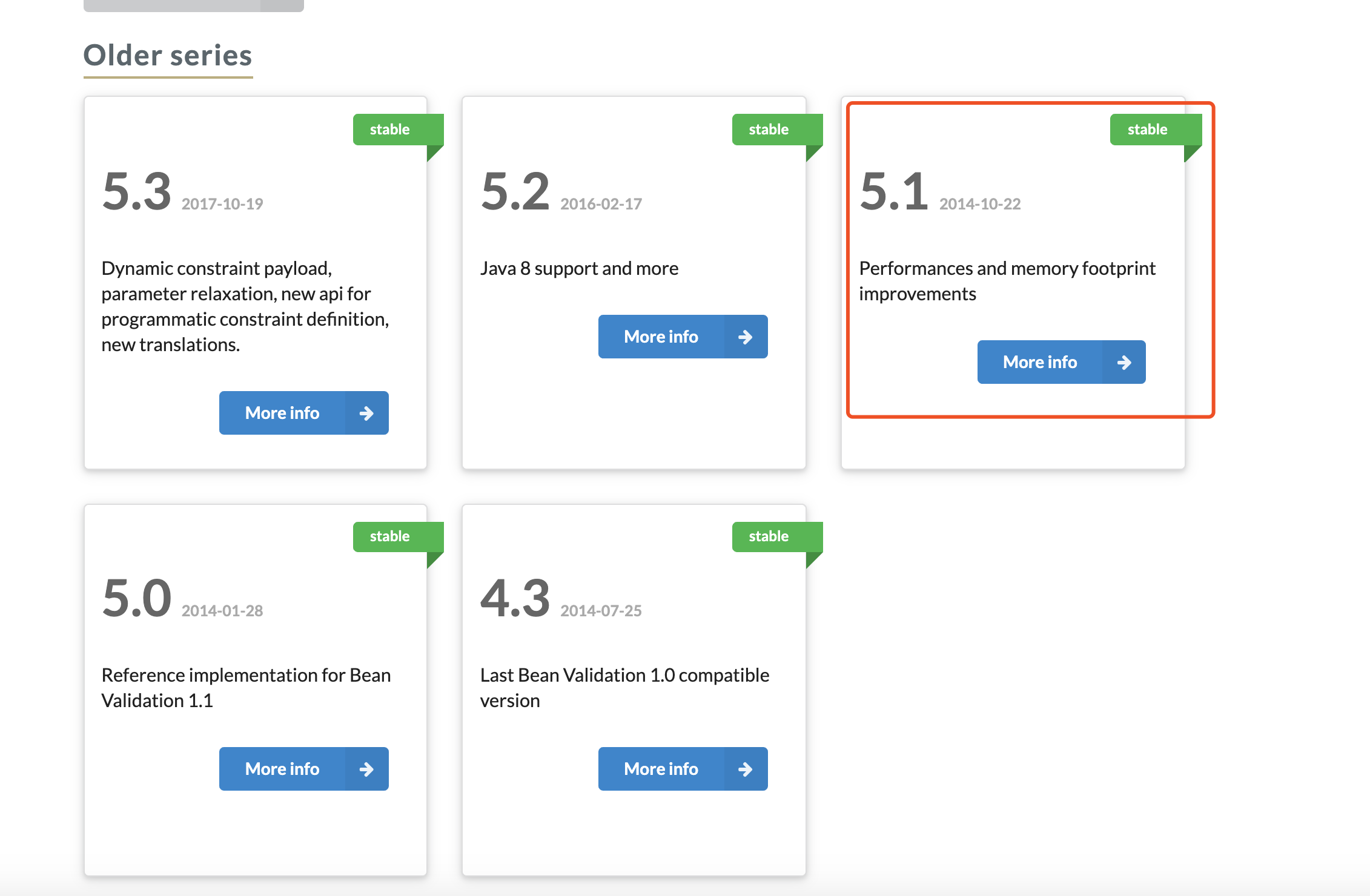 标红的地方正是该规范的实现厂商,以Hibernate Validator进行说明,点击5.1.1.Final进入Hibernate Validator的官网,看到以下画面: