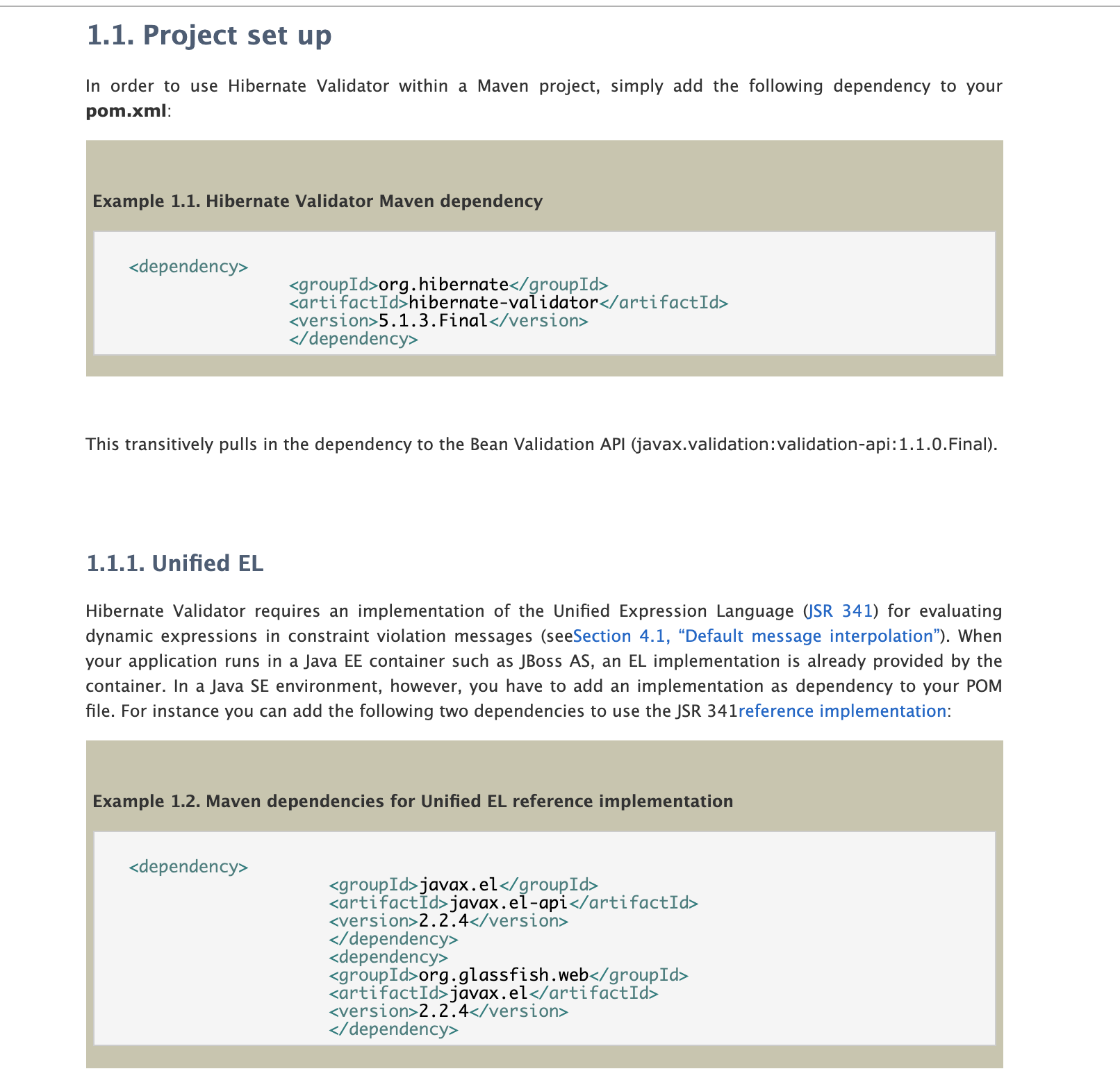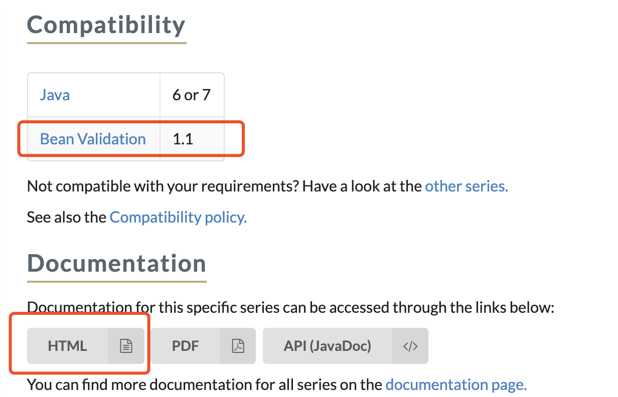点击进入后,会看到该版本兼容Bean Validation 1.1,也就是JSR-349。下面的文档区域我们也可以点开看看,里面有详细的介绍。