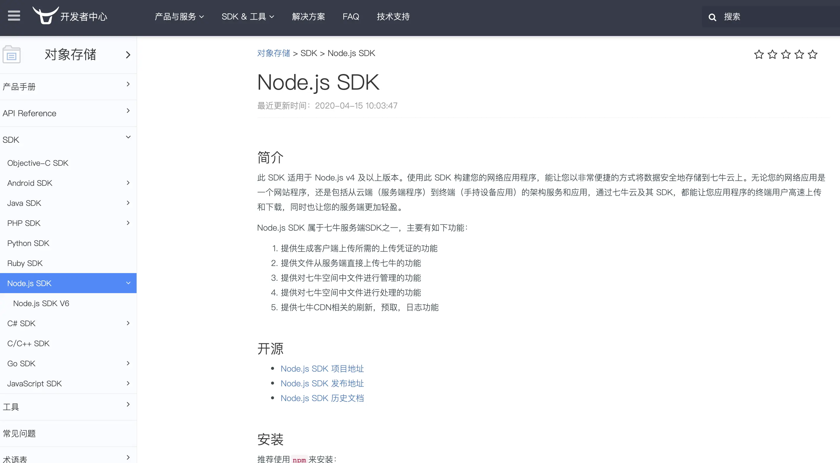 开通好了,我们就拿到了一些关键的信息,如AccessKey、SecretKey、存储空间名、访问地址、存储区域。 有了这些,我们再来看一下七牛云对象存储的提供Node.js版本的开发接口。