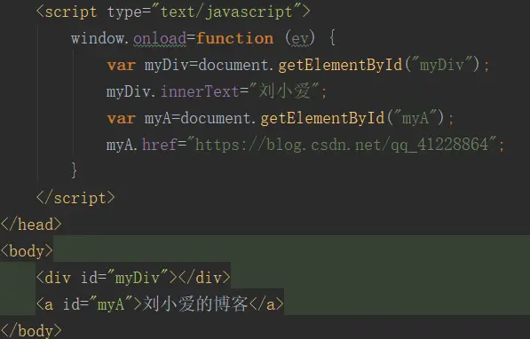 给div标签添加了一个内容:“刘小爱”;给a便签添加了一个超链接。也就是昨天刚学的DOM编程。
