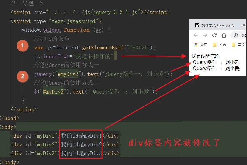 - jQuery对象的方法:jq.text("刘小爱")。