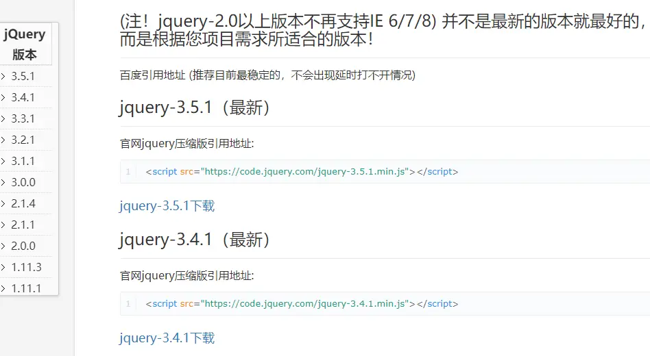 版本从1.11.1到3.5.1不等,不过版本不一定越新越好,看实际需求。百度用的jQuery版本还是1点几呢。