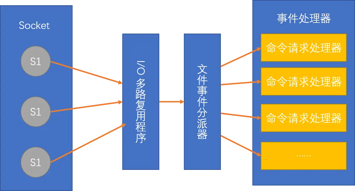 它采用 IO 多路复用机制同时监听多个 socket ,将产生事件的 socket 压入内存队列中,事件分派器根据 socket 上的事件类型来选择对应的事件处理器进行处理。
