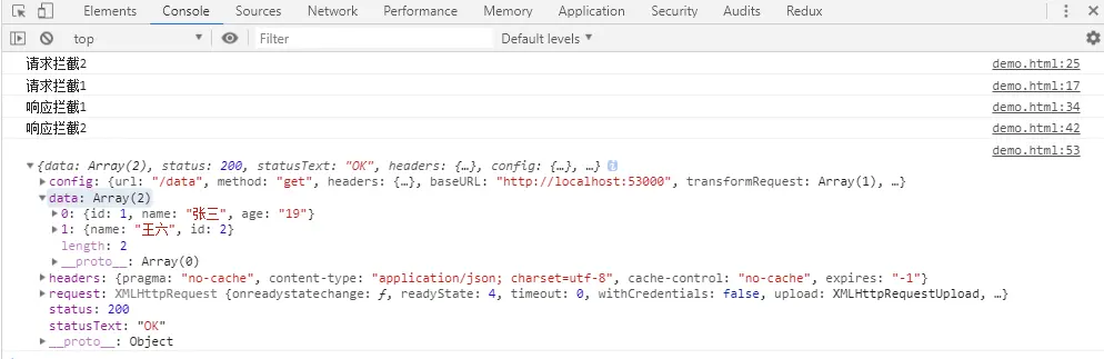 结果不用解释,但是有一个奇怪的现象,就是 请求拦截2 先触发,再是 请求拦截1,而 响应拦截1 先触发 ,再是 响应拦截2,是不是一个奇怪的现象,带着这个疑问,我们接续来看