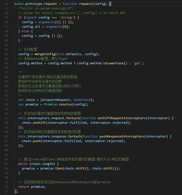 在 axios 的源码工程中,core/Axios.js 中 在 Axios 的原型上绑定了 request 方法