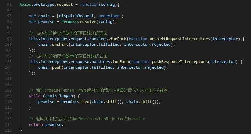 1、创建一个 chain 数组,数组初始化有两个元素,是 dispatchRequest ,undefined,dispatchRequest 就是真实请求的方法,为什么要加 undefined 呢,是因为,在我们在添加请求拦截和响应拦截的时候,是两个方法两个方法放进这个数组的,而且使用 Promise 执行的时候也是两个方法两个方法执行,如果初始值只有一个,在使用 Promise 执行的时候,就会出现问题。