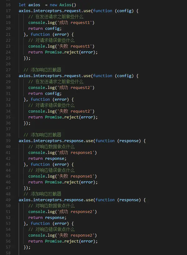 那么我们这个时候来解释一下,刚开始的时候,为什么会出现,如果我们有两个请求和响应拦截的时候,为什么会先触发 请求拦截2 的方法,因为 unshift 将后面的请求的拦截放到了最前面,而响应拦截的时候我们使用的是 push 方法,那么它才会依次去执行 响应拦截1 响应拦截2