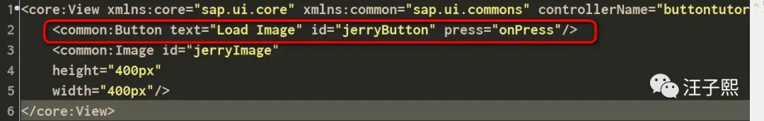 一个传统的基于SAP UI5的应用,其XML视图里,声明一个Button控件的用法,见下图第二行: