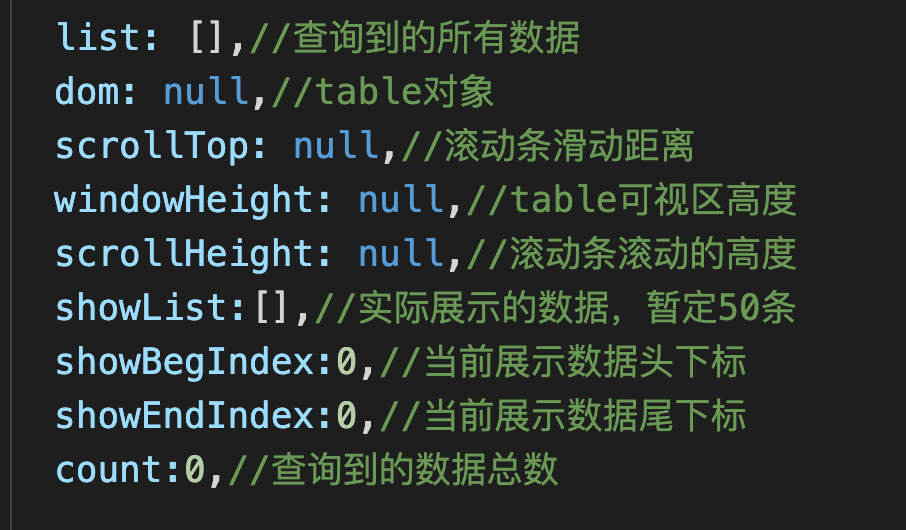 我们真正需要展示的数据,并不是从后台拿到的原始数据(list),而是我们处理过后的数据(showList),同时,我们需要两个变量,showBegIndex和shoEndIndex,从list中取我们需要的数据。