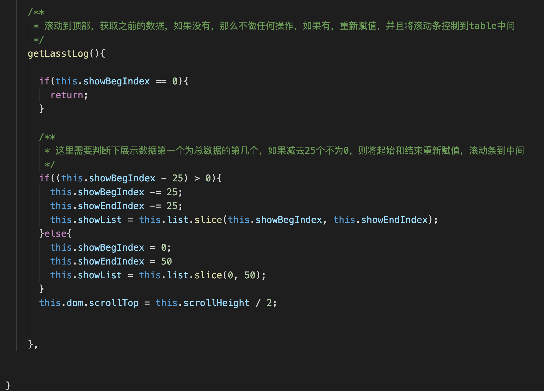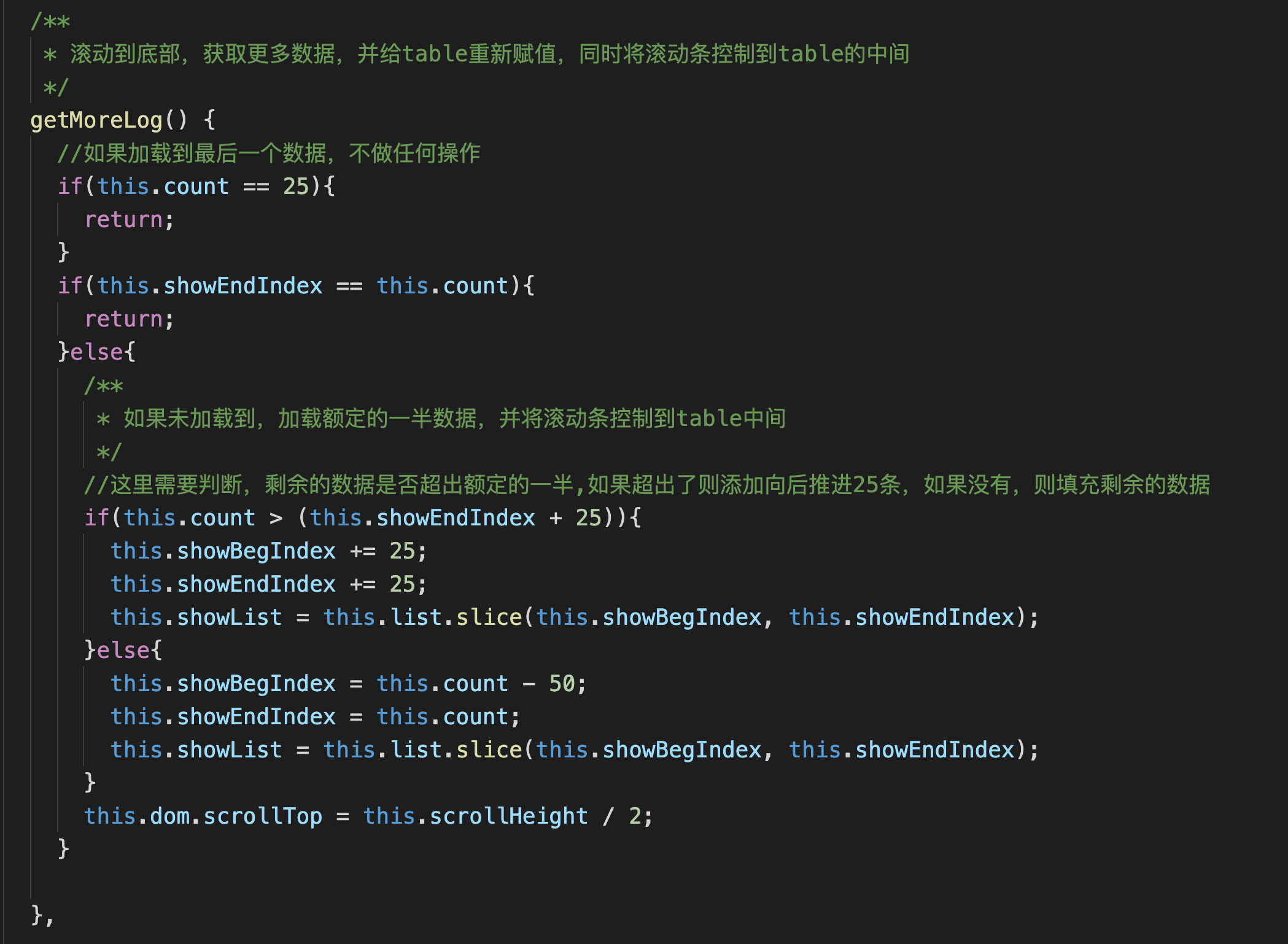 下滑加载更多的方法,只要判断好下标,可以看到,我这里的操作为,将需要截取的下标起点和终点各增加25,这样,实际只是展示了新的25条数据,同时滚轴设置到table中间,对于用户而言,体验较好,不会显得很突兀