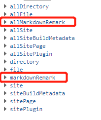 重启服务,查看终端,你会发现打印出很多创建的节点:SitePage, SitePlugin, Site, SiteBuildMetadata, Directory, File, MarkdownRemark,我们关注的只有MarkdownRemark,于是修改函数使其仅仅记录 MarkdownRemark 节点;我们使用每一个 md 文件的名称来作为路径,如要获取文件名称,你需要遍历一遍它的父节点 File,File节点包含了我们需要的文件数据。