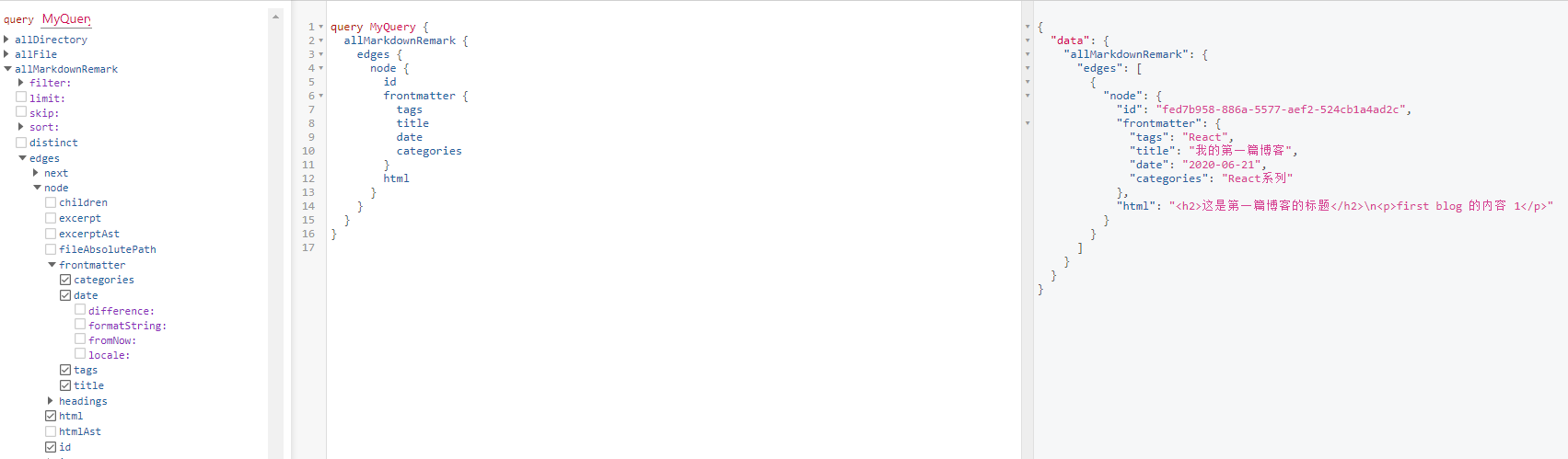 看到这里没学过 GraphQL 也不用怕,因为用到的不多而且 Gatsby 内置一个界面方便我们操作。GraphQL 目前国外比较火,它作为一门新技术,即使不深入我们也可以了解一下。
