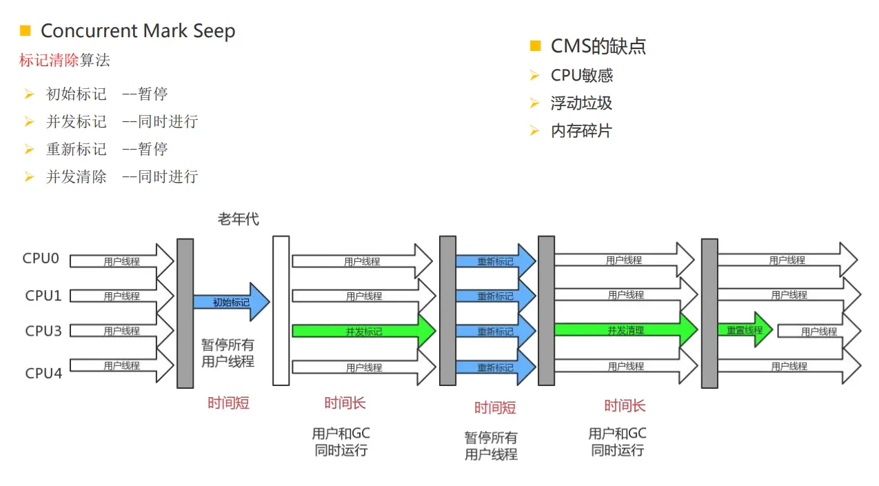 CPU敏感: CMS对处理器资源敏感,毕竟采用了并发收集,当处理核心数不足四个时,CMS对用户影响较大。