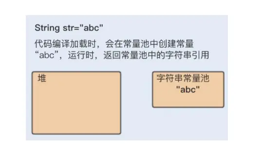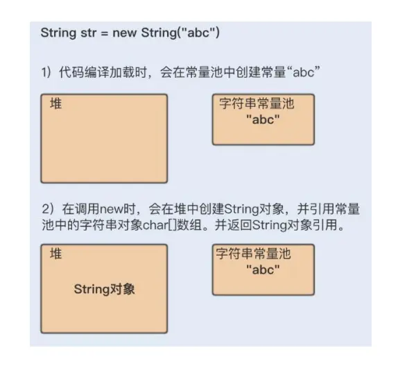 这种方式,首先在编译类文件时,"abc"常量字符串将会放入到常量结构中,在类加载时,"abc"将在常量池中被创建;其次,在调用new时,JVM命令将会调用String的构造函数,同时引用常量池中的"abc"字符串,在堆内创建一个String对象,最后,str引用String对象。如果调用