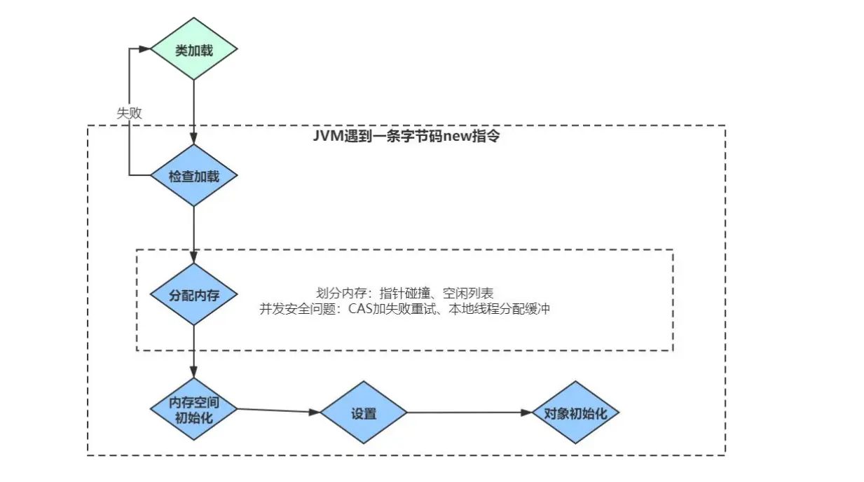 虚拟机遇到一条 new 指令时,首先检查是否被类加载器加载,如果没有,那必须先执行相应的类加载过程。