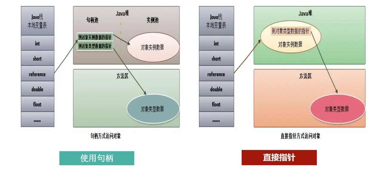 如果使用句柄访问的话,那么Java 堆中将会划分出一块内存来作为句柄池,reference 中存储的就是对象的句柄地址,而句柄中包含了对象的实例数据与类型数据各自的具体地址信息。