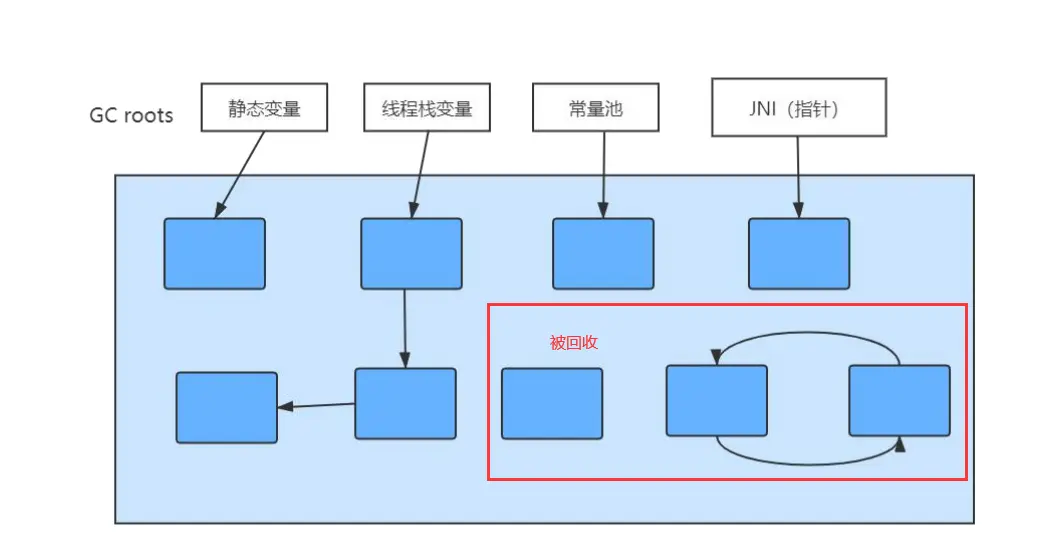 JNI(即 native 方法)引用的对象 JVM的内部引用 (class对象,异常对象NullPointException、OutofMemoryError,系统类加载器)。- 所有被同步锁 ( synchronize 关键字) 持有的对象