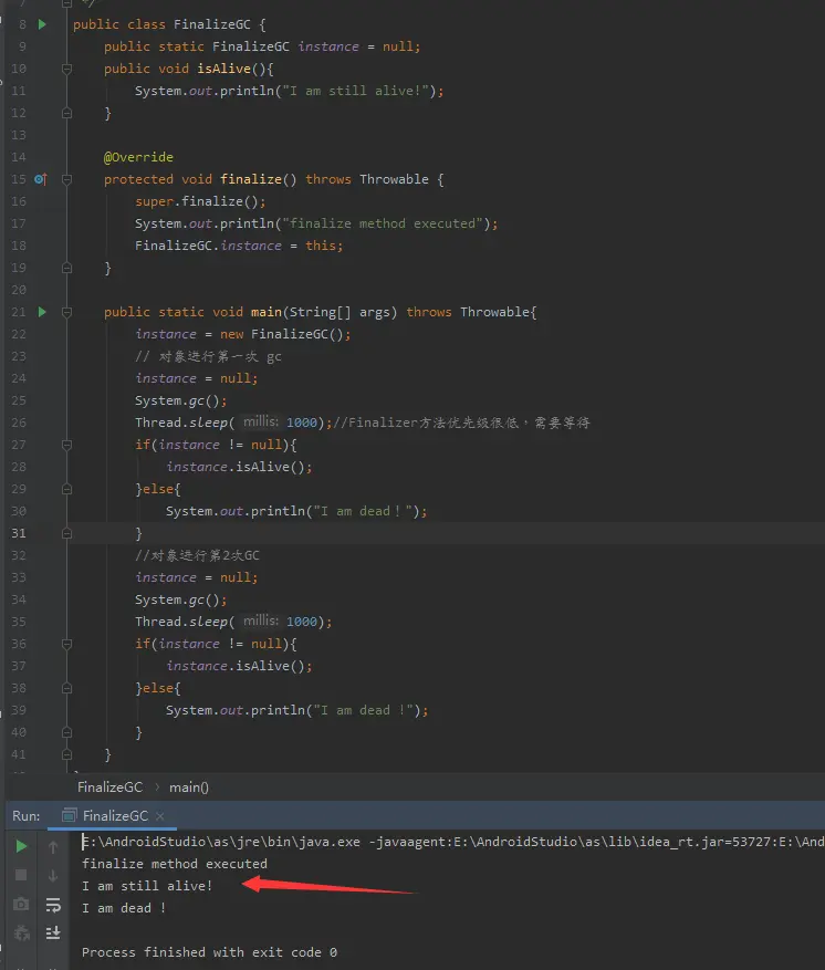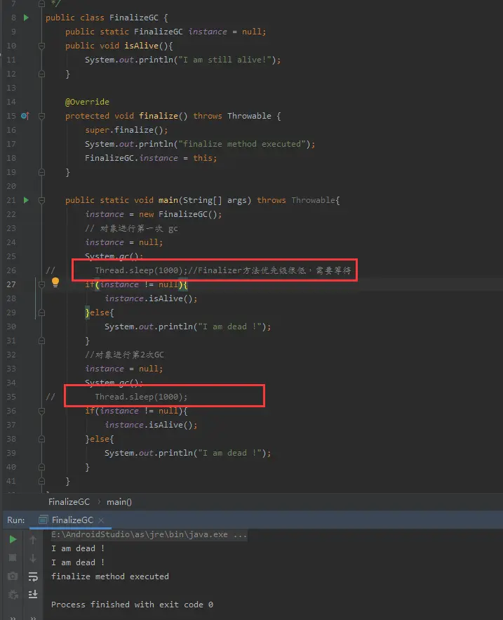 可以看到,对象并没有被拯救,原因是 finalize() 执行缓慢,还没完成拯救,垃圾回收器就已经回收掉了。