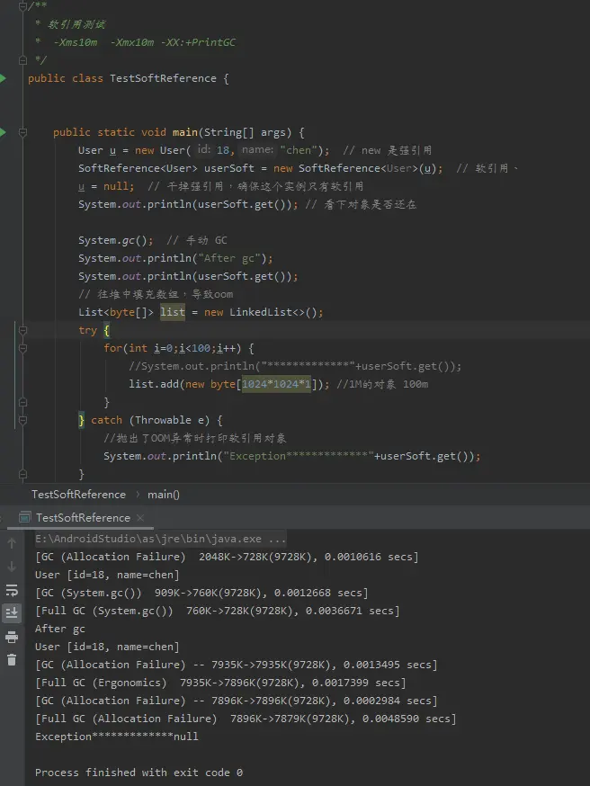 用软引用关联的对象,内存空间不足( 即将发生内存溢出 OuyOfMemory)的时候,这些对象就会被回收,如果这次回收之后还是没有足够的空间,才会抛出内存溢出