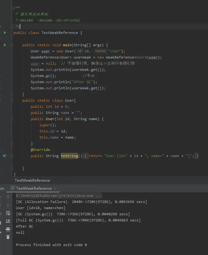 用弱引用关联的对象,只能生存到下一次垃圾回收之前,GC 发生时不管当前内存足够与否, 都会将其回收