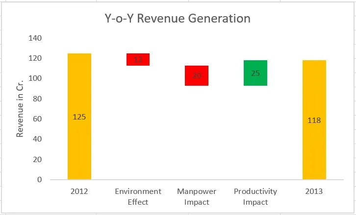 在瀑布图中,初始值和最终值由列表示。描述正面和负面影响的列用不同颜色的浮动列表示。