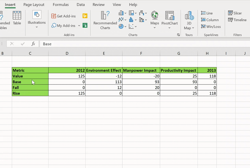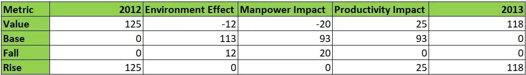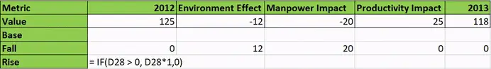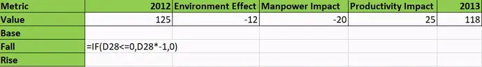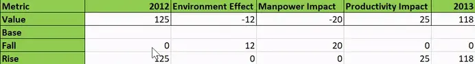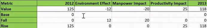 为了制作瀑布图,我们需要对数据表进行一些更改。我们将把值列分为3列,Base、Fall和Rise列。让我们看看它的用途以及如何添加这些列。