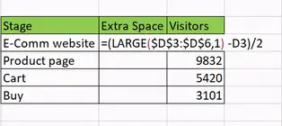 - =(LARGE($D$3:$D$6,1)-D3)/2