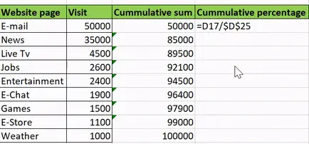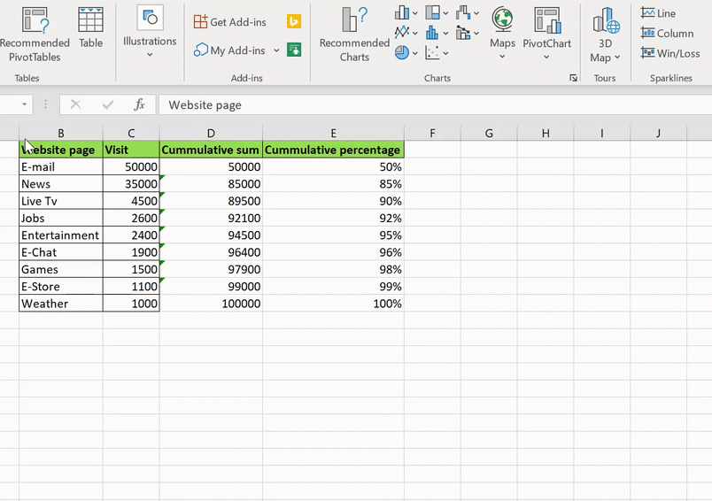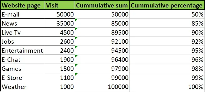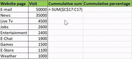 我们需要计算网站访问的累计百分比。为了做到这一点,我们将添加列,累计总和和累计百分比。让我们看看如何: