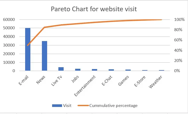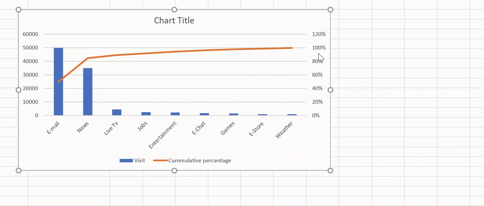 在上面的图表中,我们有一个由访问量和累计百分比组成的聚集条形图。由于数值尺度的差异,后者不可见。
