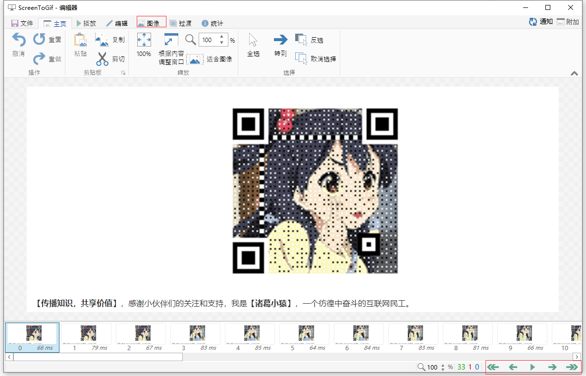 在这个界面可以看到,下面一排是一帧一帧的图片。可以选中不要的图片进行删除。同时右下角有相关的预览按钮。图像菜单里有水印可以添加。相关的编辑都比较容易。
