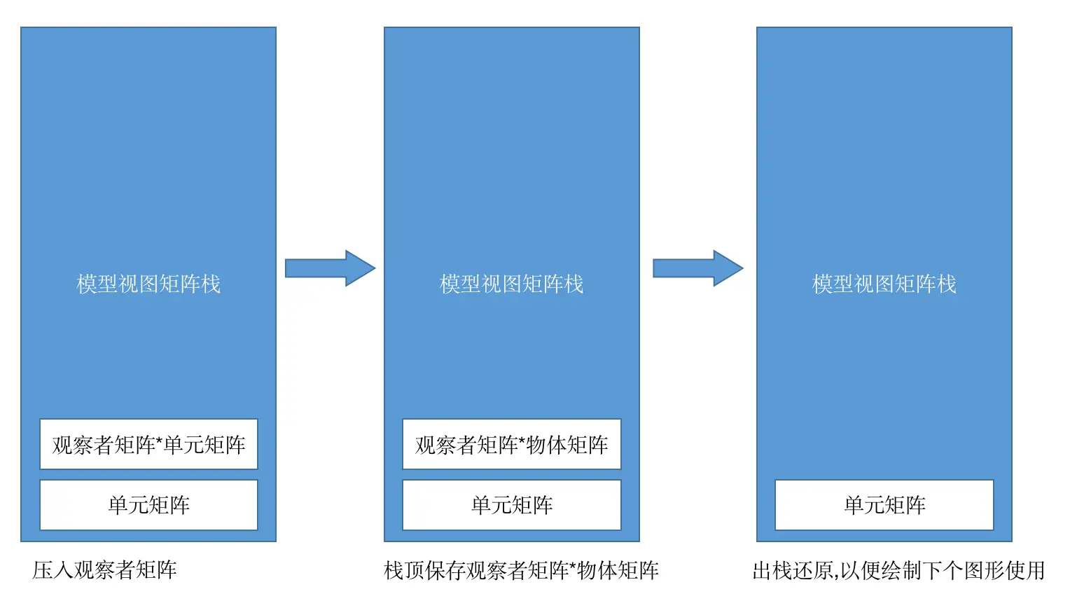首先会在模型视图矩阵栈中压入一个单元矩阵,作用类似1,与任何数据相乘,数据都不变