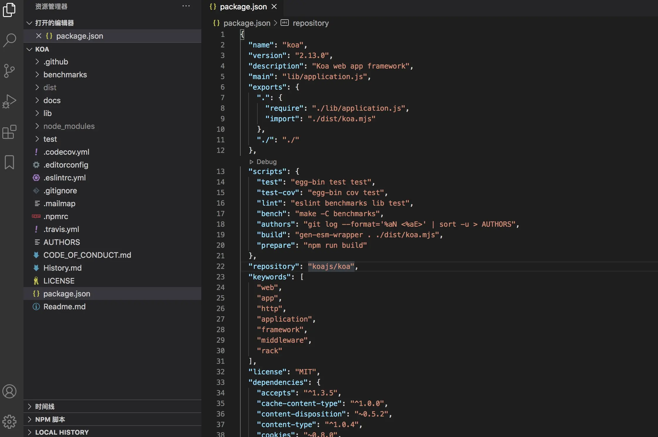 至此,我们可以确定Koa项目是不编译的,导出使用的就是源码,所以没有src目录只有lib目录,lib目录的内容就是源码。而且只有4个文件加一起只有不到2000行,真的是足够小巧精干。