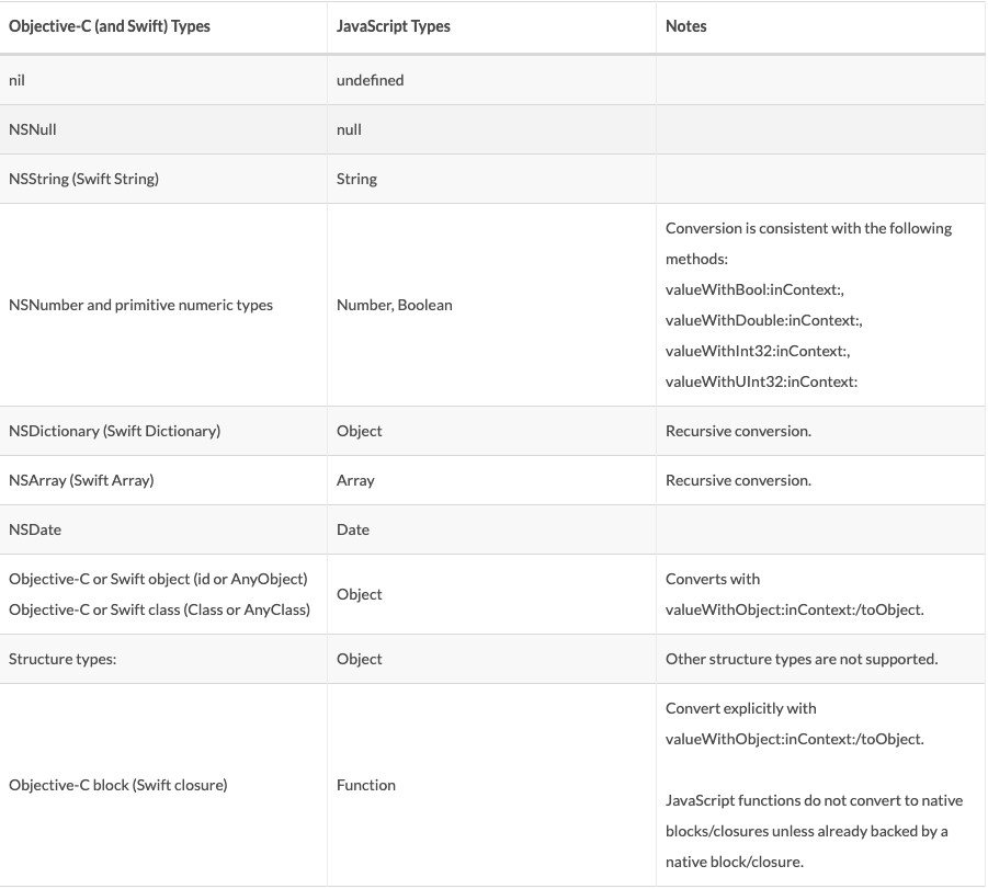 不管是 js 传递给 OC 还是 OC 调用 JS,我们需要清除 OC 和 JS 数据类型,以便能够使用适合的数据结构获取数据。