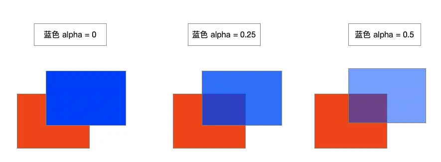 最终颜色是以原先的红色(目标颜色)与后来的蓝色(源颜色)进行混合。源颜色的 alpha 值越高,添加的蓝色颜色成分越高,目标颜色所保留的成分就越少。