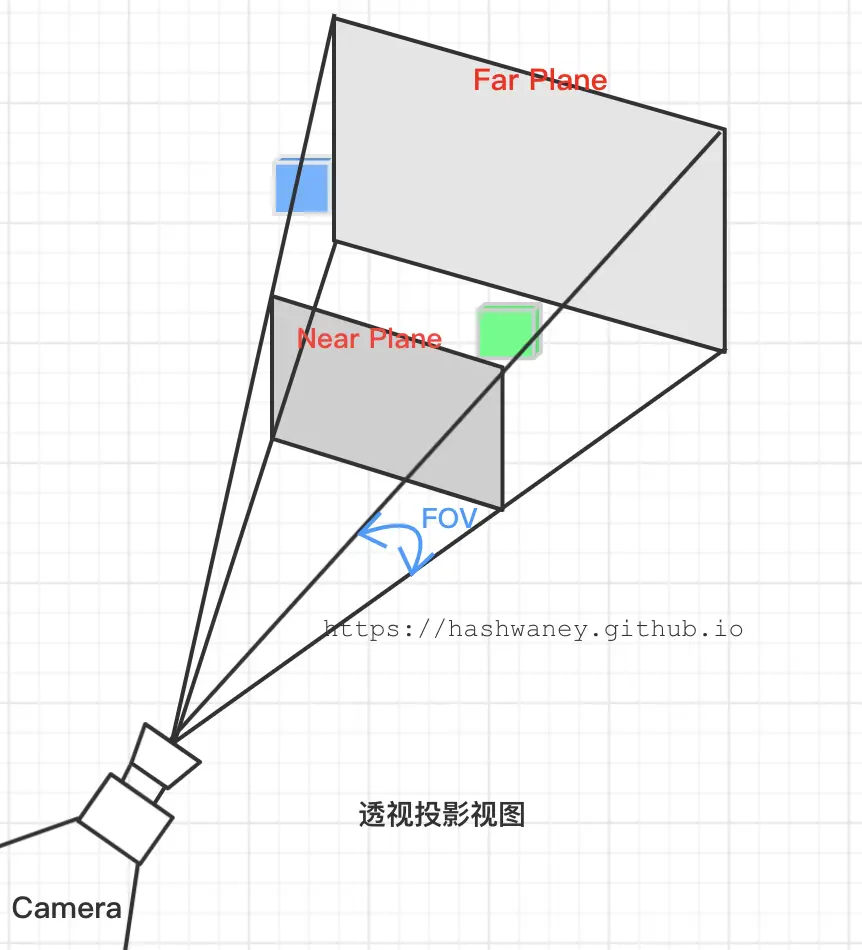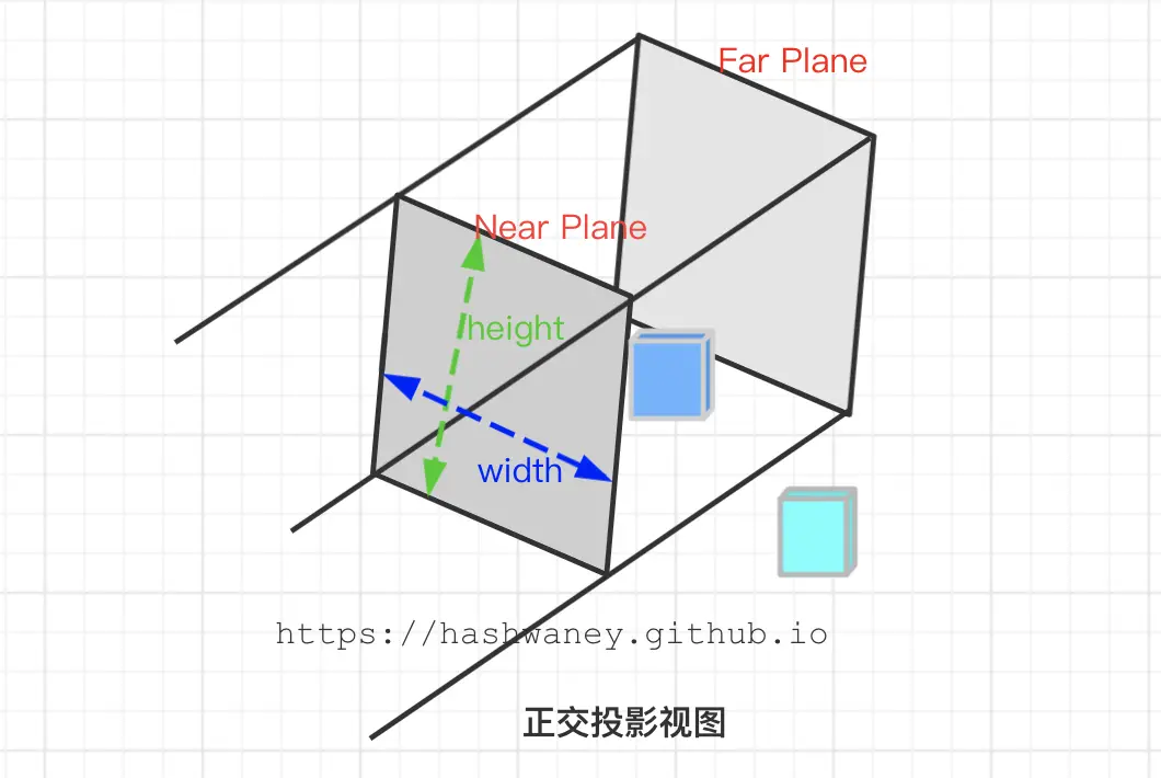 如上图,定义了可见的坐标,由宽、高、近平面和远平面所指定的。任何出现在近平面之前或者远平面之后的坐标都会被裁剪掉。
