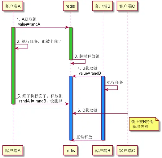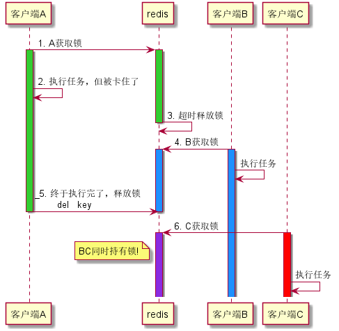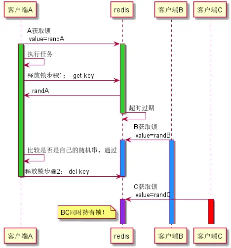 del key将B当前正在持有的锁释放了 (但B此时不知情,还以为自己持有锁,继续执行自己的任务) - 另有客户端C获取锁,这时客户端B和C同时持有,不满足互斥性了